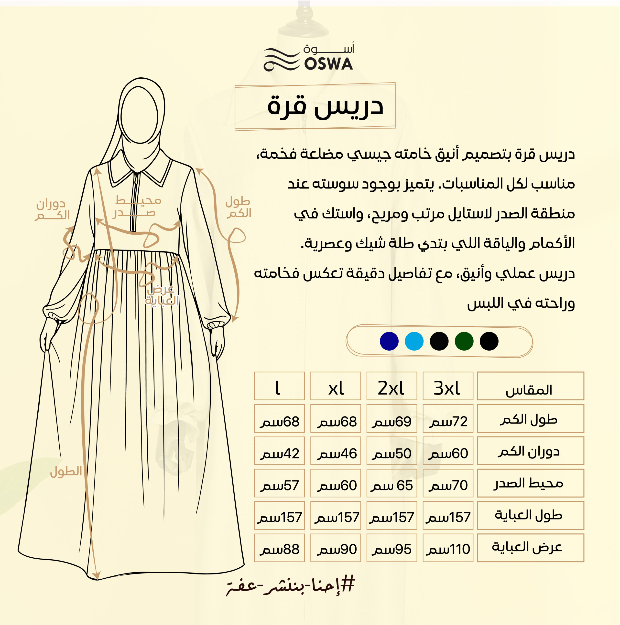 دريس قرة بتصميم أنيق خامته جيسي فخمة، مناسب لكل المناسبات. يتميز بوجود سوسته عند منطقة الصدر لاستايل مرتب ومريح، واستك في الأكمام والياقة اللي بتدي طلة شيك وعصرية. 💖